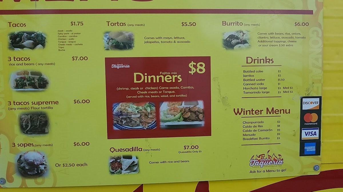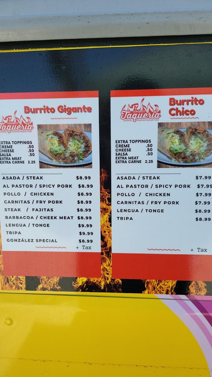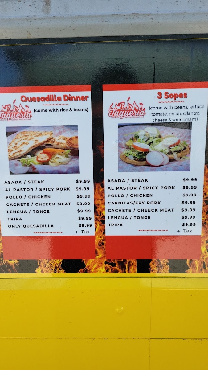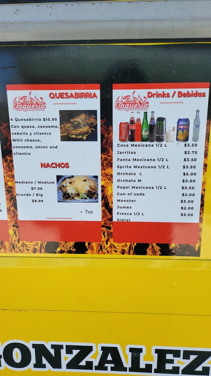 Wrapping up my look at the menu of Taqueria Gonzalez, it’s clear that this spot focuses on bold, comforting Mexican street food done with variety and intention. The taco selection starts strong with the Birria Taco, setting the tone for a menu that clearly celebrates rich, slow-cooked flavors. To complement the mains, the sides like Salsa Verde / Green Salsa, Salsa Roja / Red Sauce, Large Beans, Medium Beans, and Rice And Beans offer simple but essential pairings that round out any order. For something heartier, the sopes section with Individual Sope and 3 Sopes delivers a satisfying, traditional option, while crowd-pleasing bundles such as 4 Ct. Birria Tacos, 50 Ct Taco Box, 10 Ct Quesabirria Tacos, 20 Ct. Quesabirria Tacos, and 20 Ct Taco Box make it easy to feed groups or satisfy big cravings. The menu also highlights convenience with 5ct Taco Box and 4ct Taco Box With Rice And Beans, alongside indulgent favorites like Individual Quesabirria Taco and 4 Ct Quesabirria Tacos. For diners wanting a full plate, the quesadilla dinners-Lengua Quesadilla Dinner, Tripa Quesadilla Dinner, Chicken Quesadilla Dinner, Cachete Quesadilla Dinner, and Quesadilla ONLY-add depth and protein variety, while classics like the Torta, Taco Bowl, and Burrito Bowl ensure there’s something for every preference. The bold 3ct Taconazo and 3ct Taconazos With Rice And Beans stand out as filling signature choices, and refreshing drinks such as Sprite Mexicano 1/2 L and Fanta Mexicana 1/2 L neatly complete the experience. Overall, the menu feels thoughtfully assembled, balancing individual items with combo-style options, making Taqueria Gonzalez a reliable destination for both quick bites and generous, shareable meals.